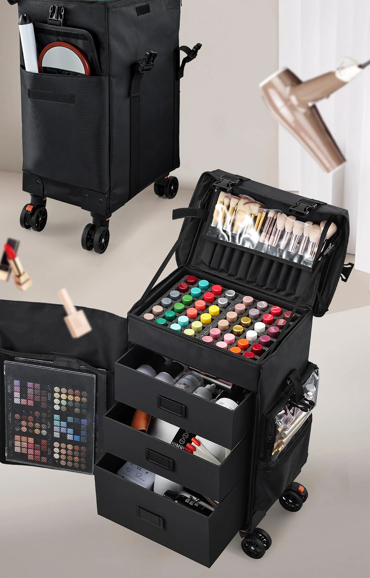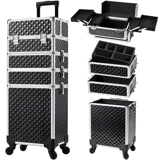 Stagiant Rolling Makeup Train Case Cosmetology Case on Wheels 4 in 1 Cosmetic Box Makeup Travel Case with Key Swivel Wheels Nail Artist Salon Barber StorageTraveling Cart Trunk Dark Green(Black)
