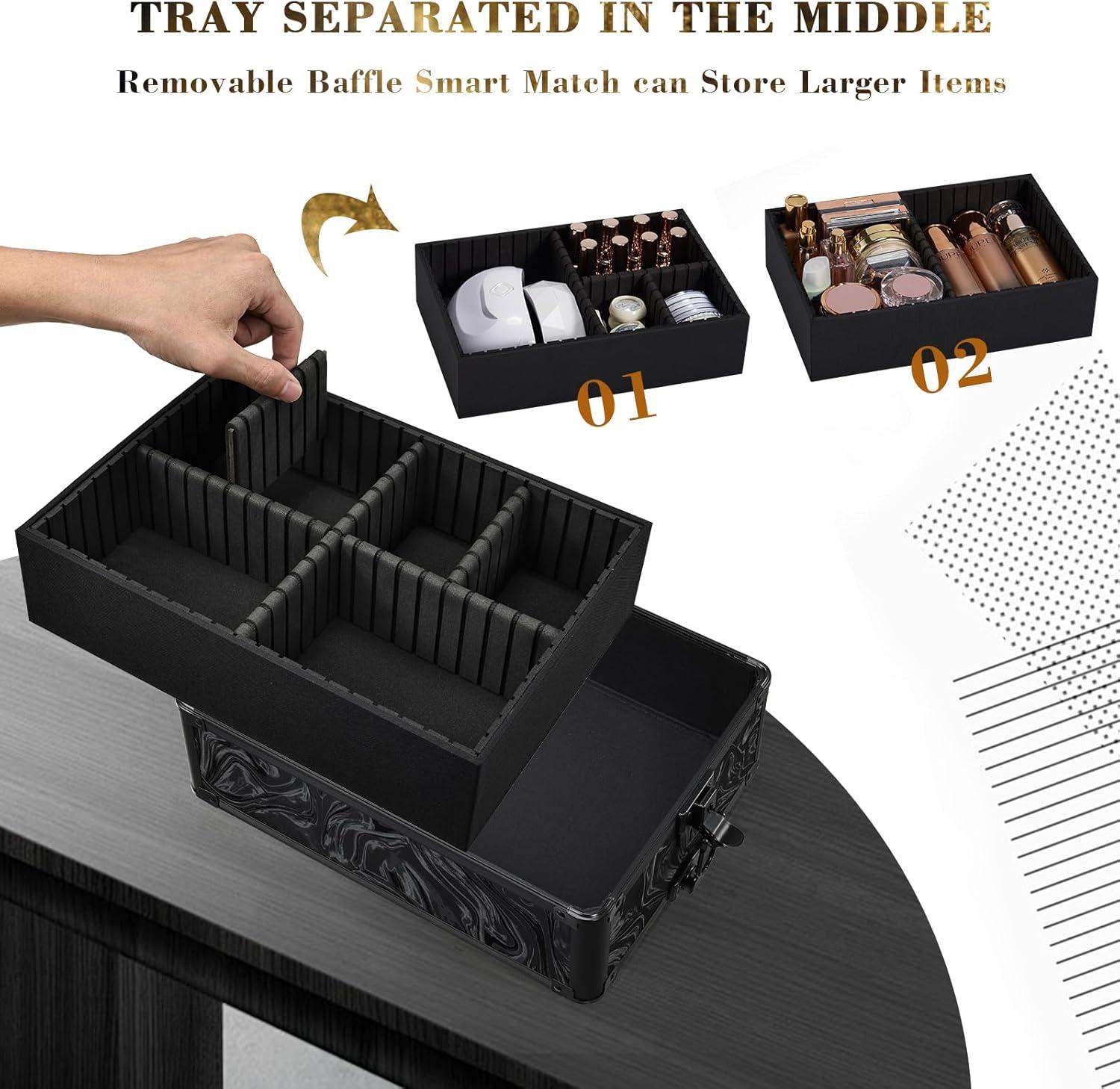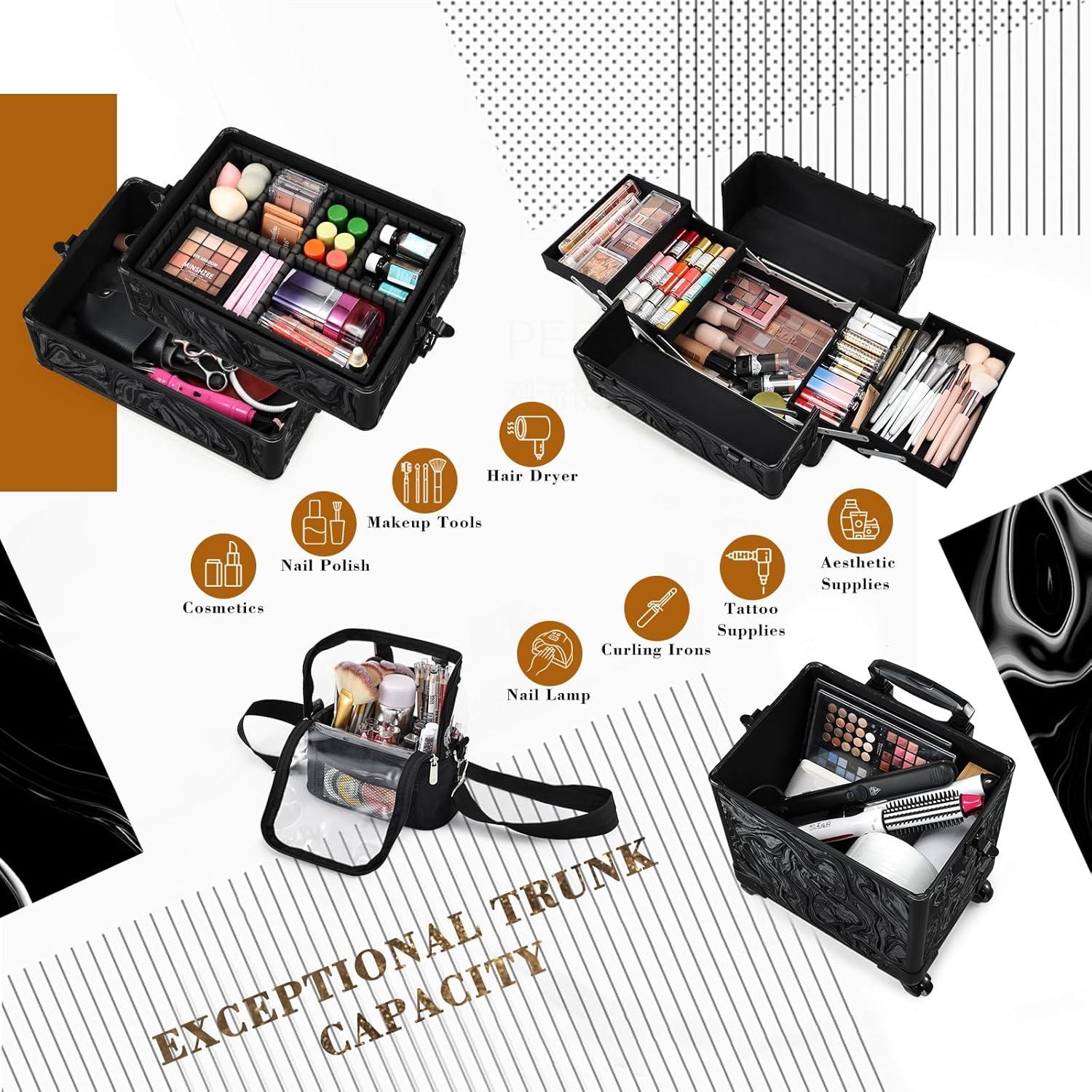 Large capacity Rolling Makeup Case: The separated middle tray with removable baffle smart match. According to the different size of gadget, you can arranged space, not only neatly placed items and can be fixed to prevent shaking and falling damage. There is also a large bottom has a great storage for hair styling tools, cosmetics and nail tools. Perfect for professional makeup artists, hairstylists, manicurists, tattoo artists or those who have a mountain of cosmetics.
