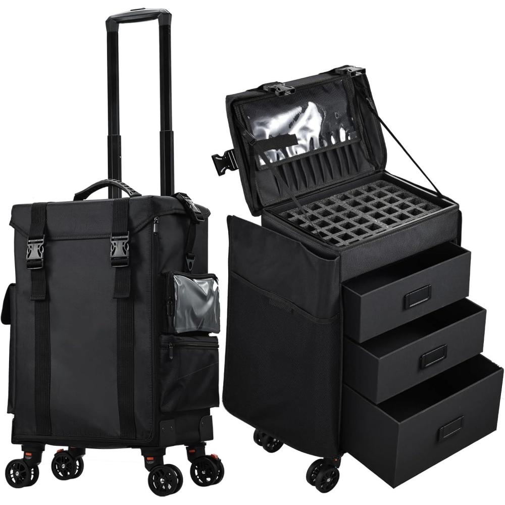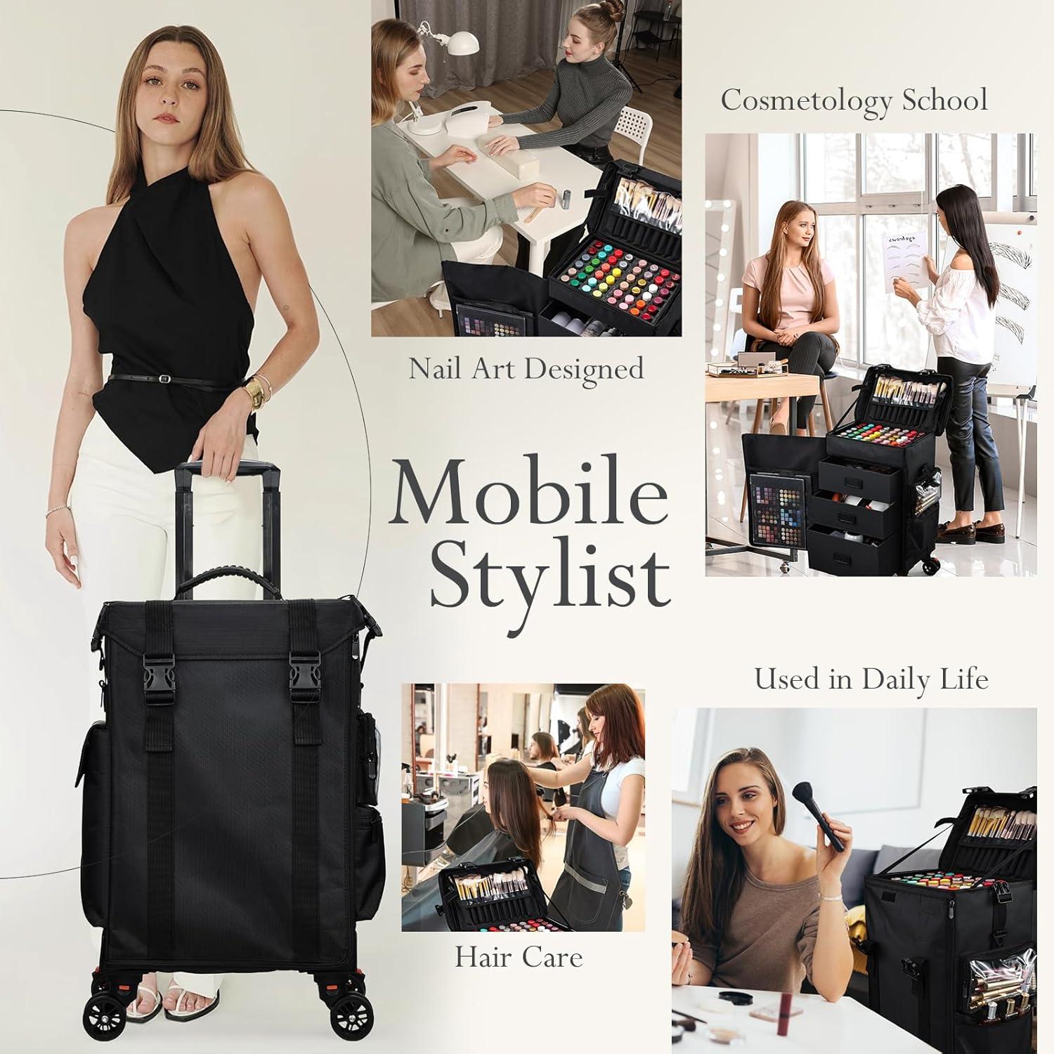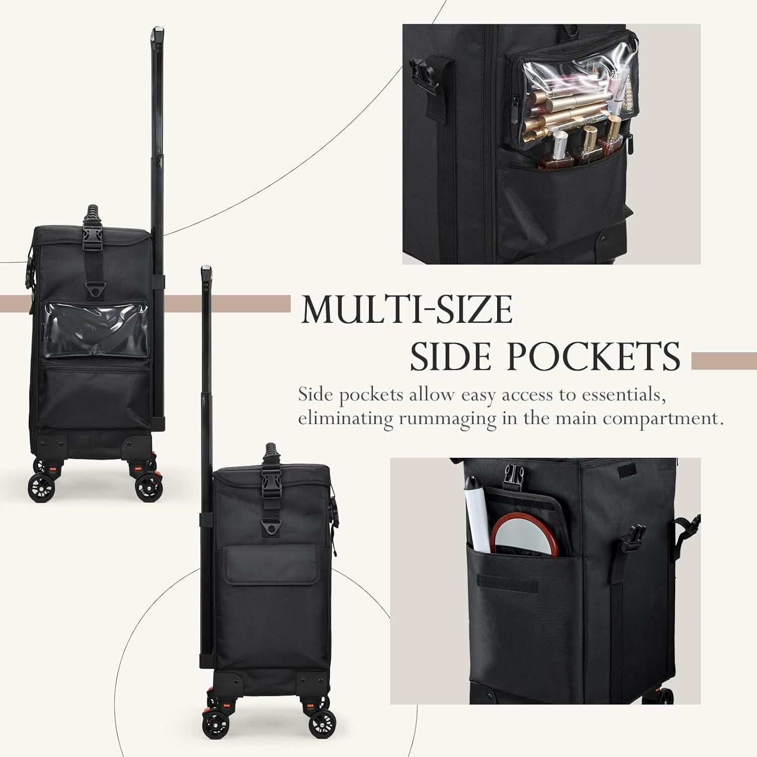 Stagiant Rolling Makeup Case 4 in 1 Soft Sided Professional Cosmetology Case on Wheels Freelance Makeup Artist Nylon Cosmetic Organize Storage Nail Technician Hair Stylist Classic Black