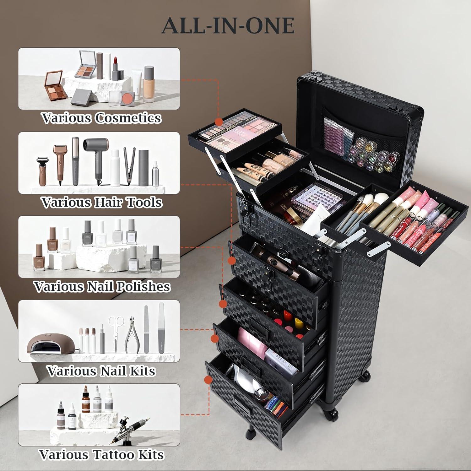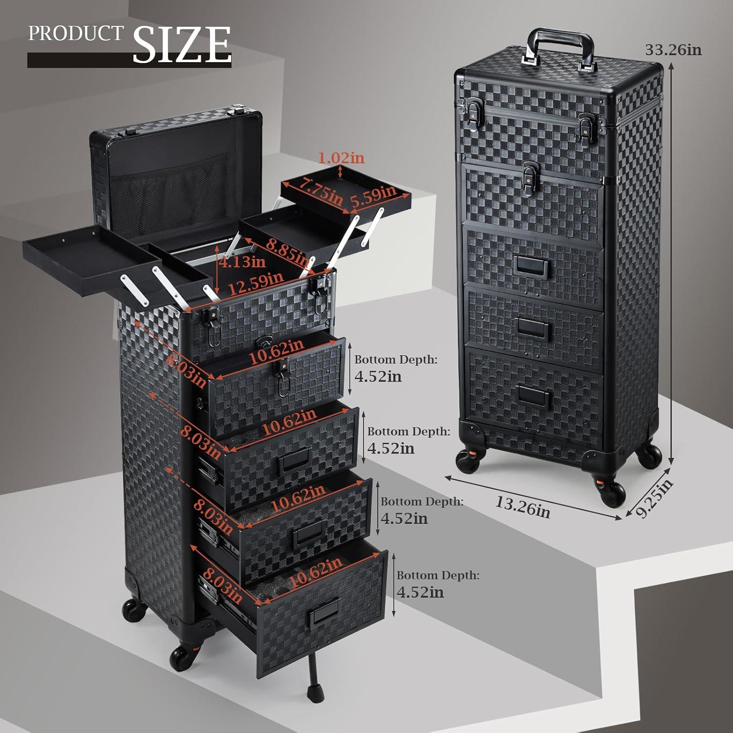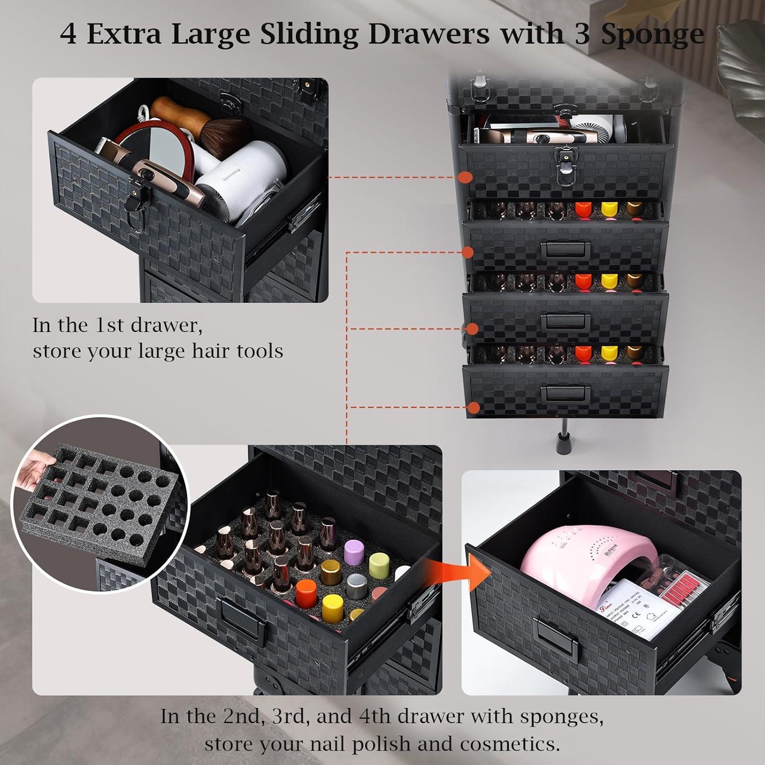 Multi-function Rolling Train Case: Upon opening, the top compartment is connected to 4 expandable trays, supplemented by a mesh pocket suitable for storing makeup tools. The makeup case incorporates three drawers, each measuring 10.62 x 8.03 x 4.52 inches, equipped with smooth gliding rails for extension and closure. The drawers have a special push-to-open design, so you can open each one drawer separately. This design renders the case an ideal choice for makeup artists, hairstylists, nail technicians, tattoo artists, and individuals with extensive cosmetic collections.