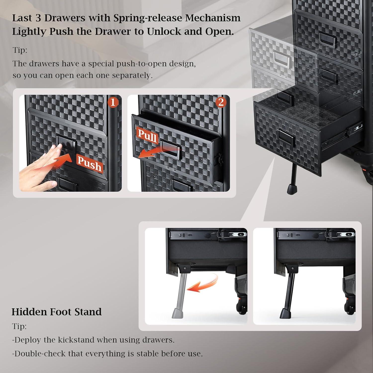 Rolling Makeup Case with Spring-Release System: The final two drawers of this vanity case are equipped with a spring-release mechanism, designed for ease of access. A gentle press on the drawer's front panel will activate the spring, allowing the drawer to open smoothly. Upon closure, the drawer will automatically lock. To prevent potential damage, it is imperative that users refrain from attempting to open these drawers without first depressing the front panel to release the spring. Adherence to this procedure will ensure the longevity and proper function of the vanity case.