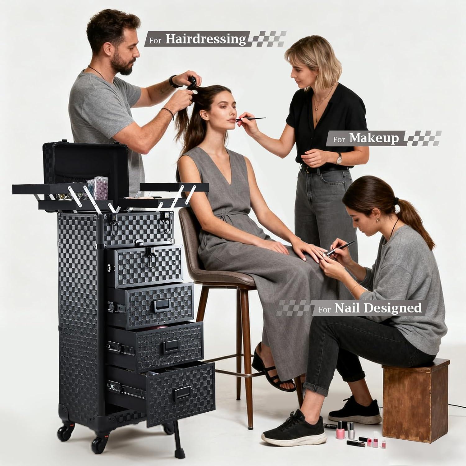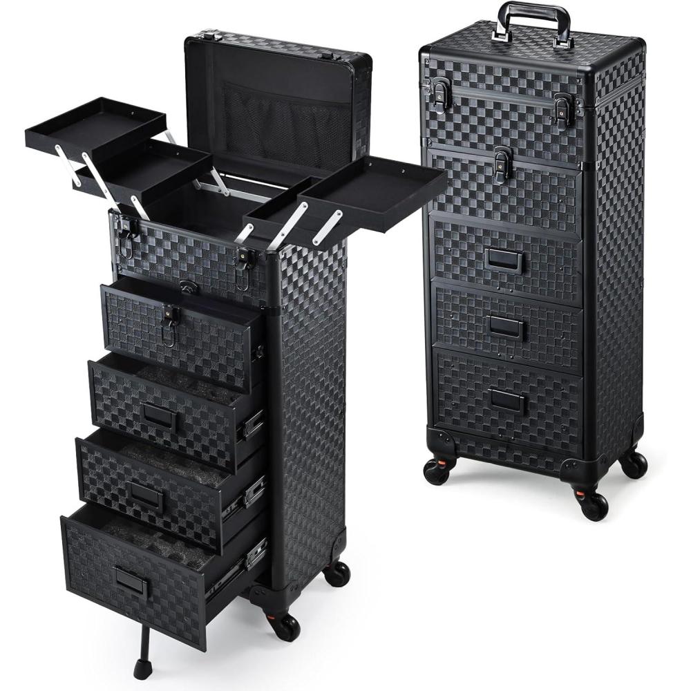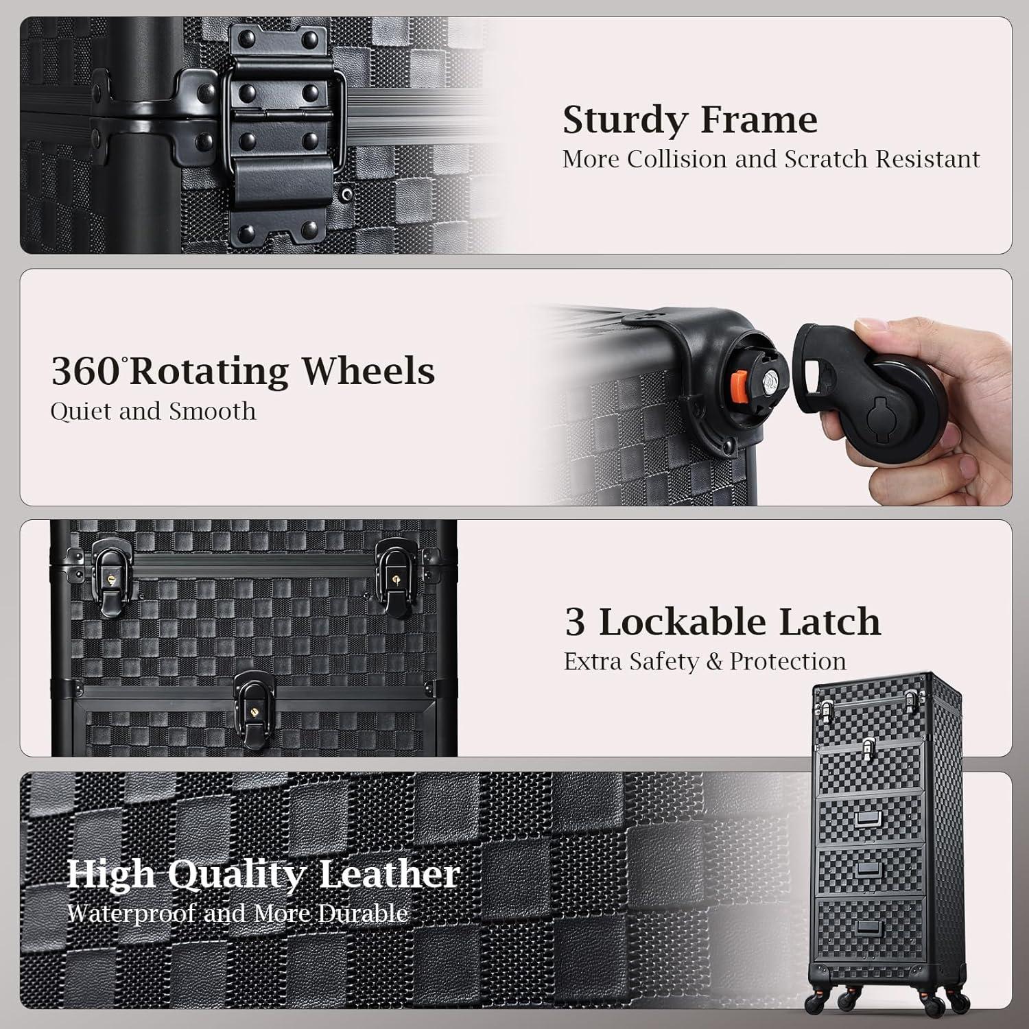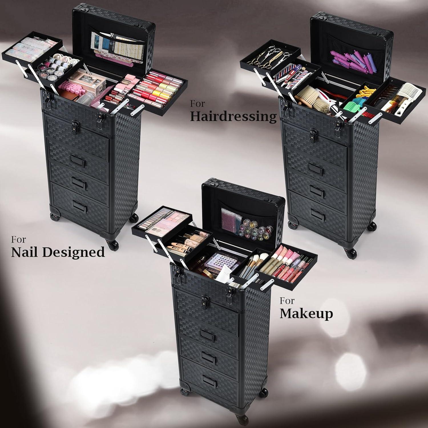 Stagiant Rolling Makeup Case with Drawers Cosmetology Case on Wheels 4 IN 1 Makeup Case 3 Drawers with Foot Stand Spring-release Mechanism Rolling Make Up Organizer for Artist Salon Nail Teach Trunk(4 Drawers Black Checkerboard)