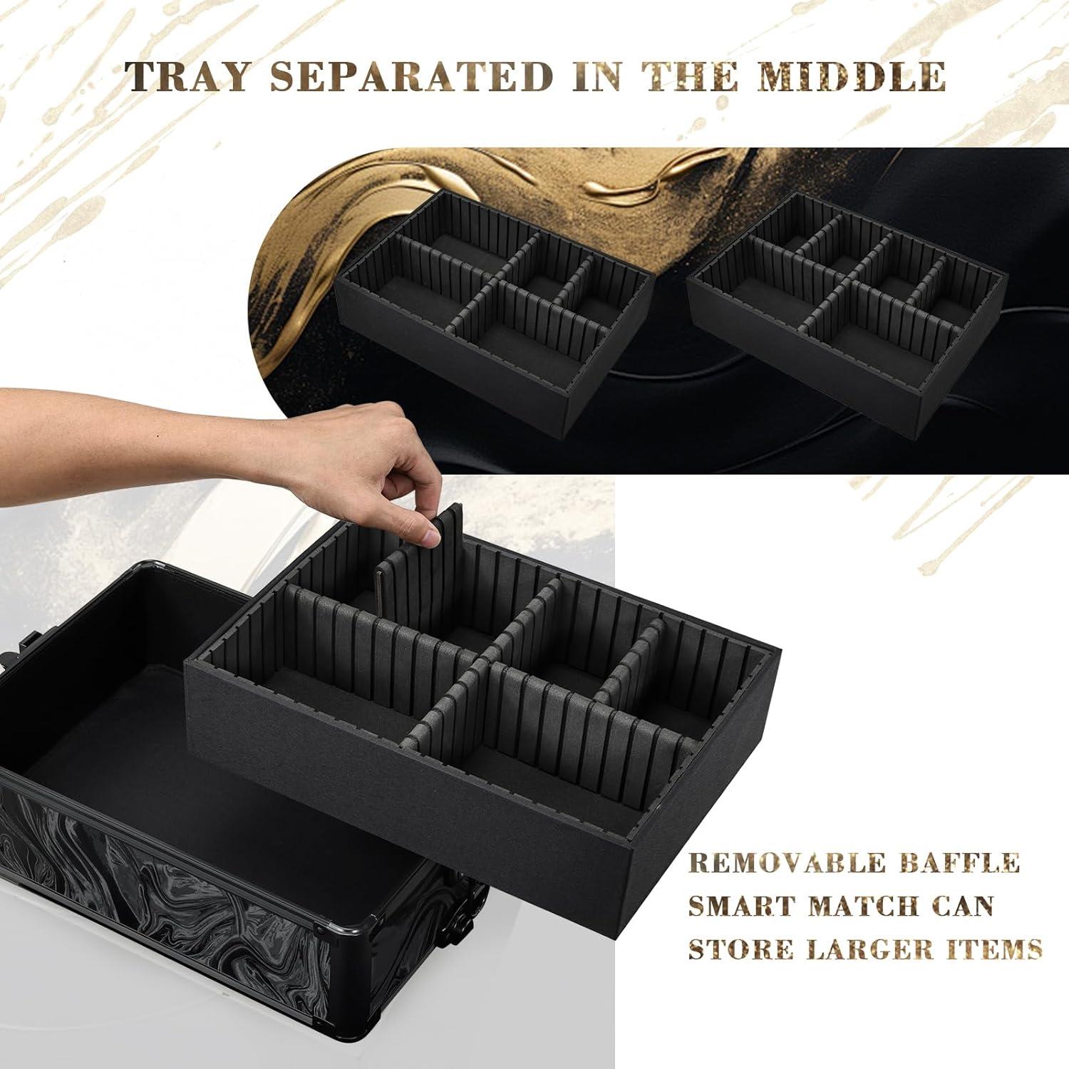 Large capacity Rolling Makeup Case: The separated middle tray with removable baffle smart match. According to the different size of gadget, you can arranged space, not only neatly placed items and can be fixed to prevent shaking and falling damage. There is also a large bottom has a great storage for hair styling tools, cosmetics and nail tools. Perfect for professional makeup artists, hairstylists, manicurists, tattoo artists or those who have a mountain of cosmetics.