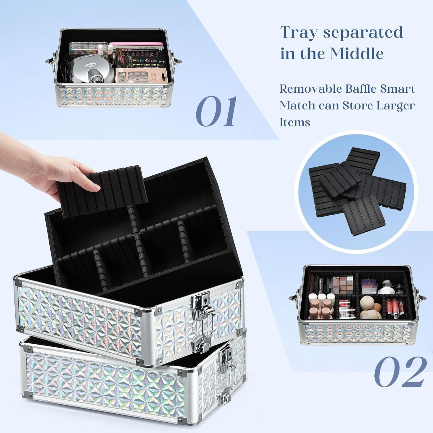 Large capacity Rolling Makeup Case: The separated middle tray with removable baffle smart match. According to the different size of gadget, you can arranged space, not only neatly placed items and can be fixed to prevent shaking and falling damage. There is also a large bottom has a great storage for hair styling tools, cosmetics and nail tools. Perfect for professional makeup artists, hairstylists, manicurists, tattoo artists or those who have a mountain of cosmetics.