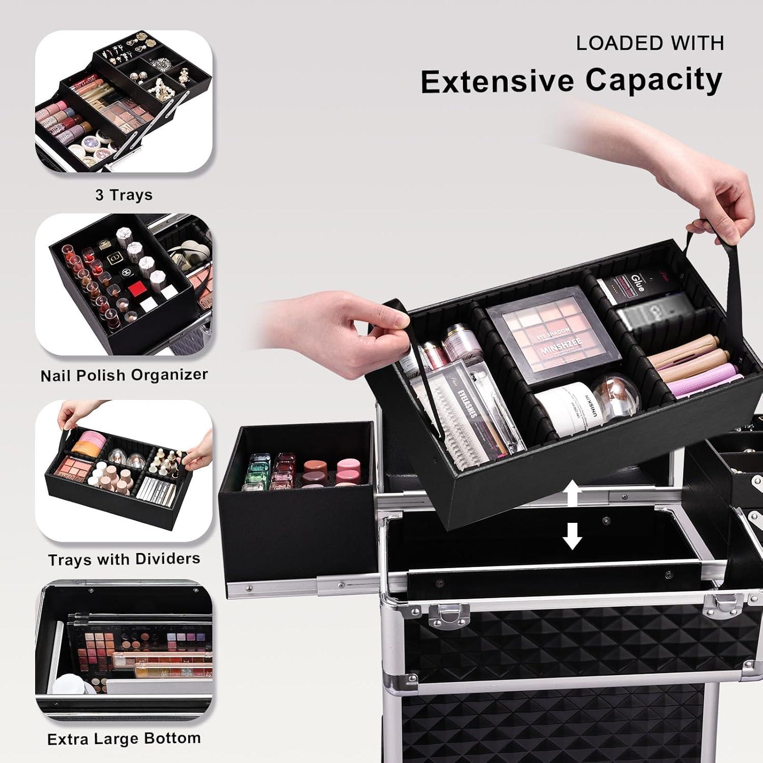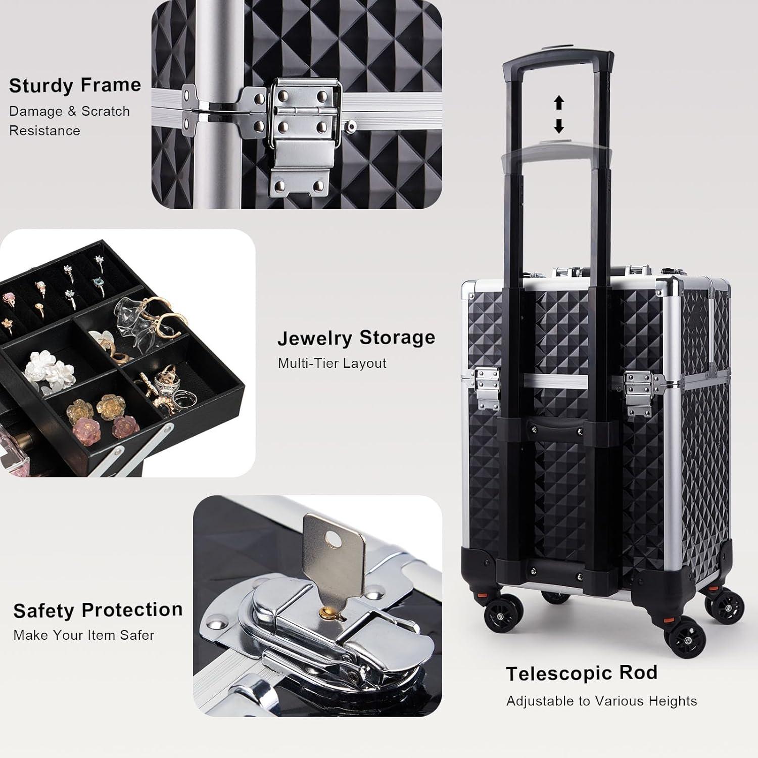 Stagiant Rolling Makeup Train Case Large Storage Cosmetic Trolley 4 Tray with Sliding Rail Removable Middle Layer with Key Swivel Wheels Salon Barber Case Traveling Cart Trunk(Pro Black)