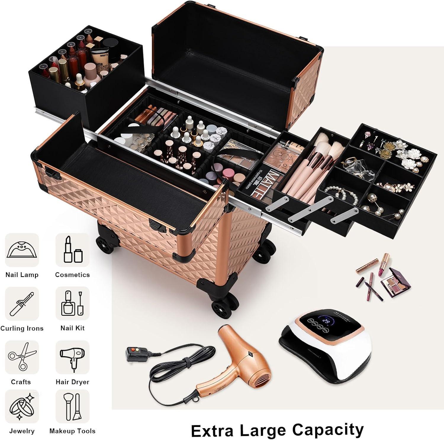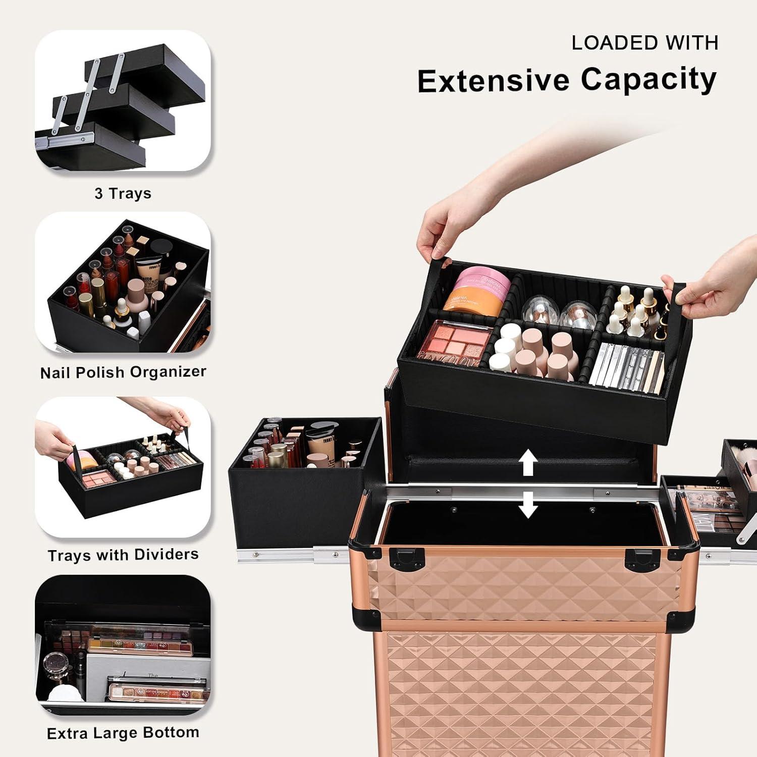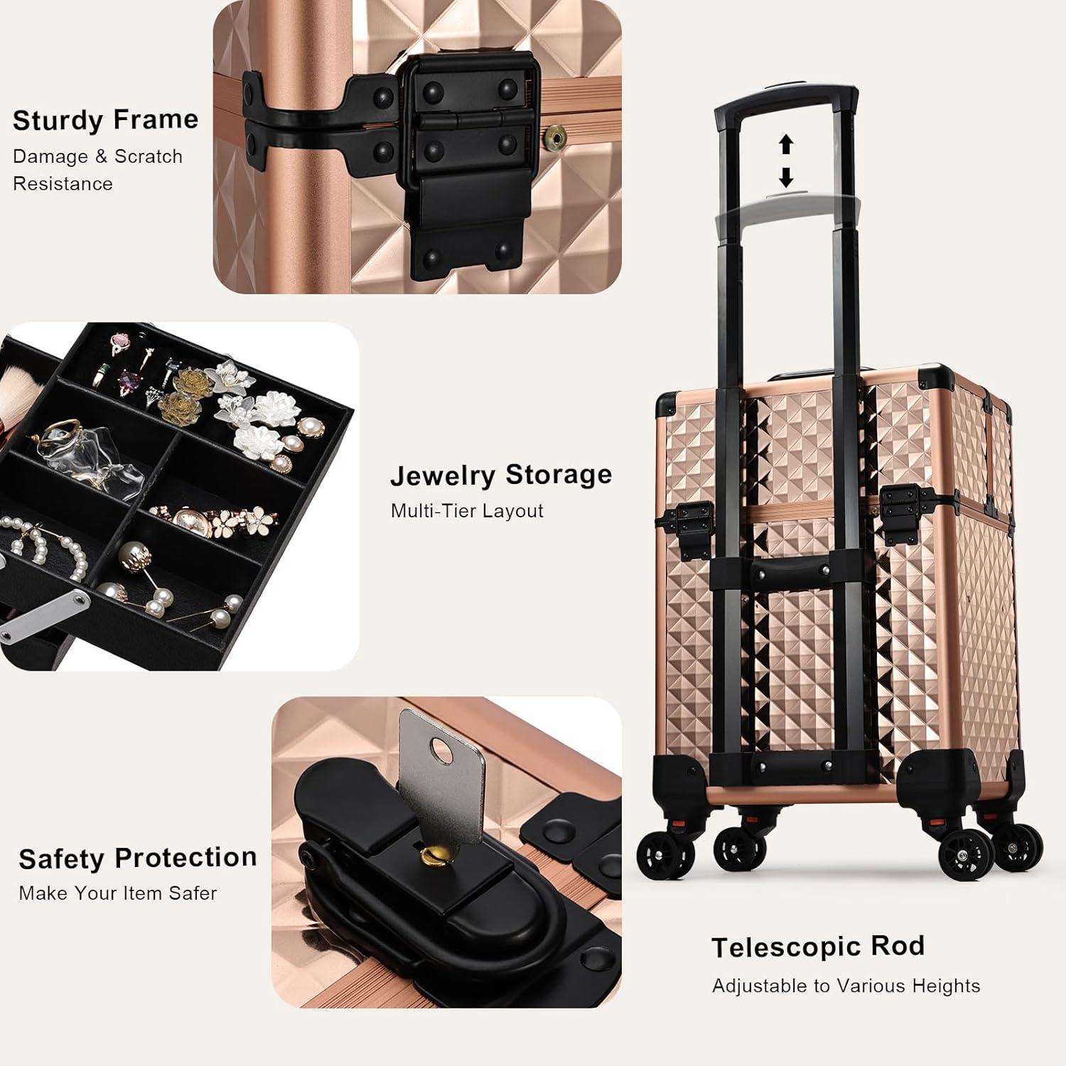 Stagiant Rolling Makeup Train Case Large Storage Cosmetic Trolley 4 Tray with Sliding Rail Removable Middle Layer with Key Swivel Wheels Salon Barber Case Traveling Cart Trunk(Rose Gold)