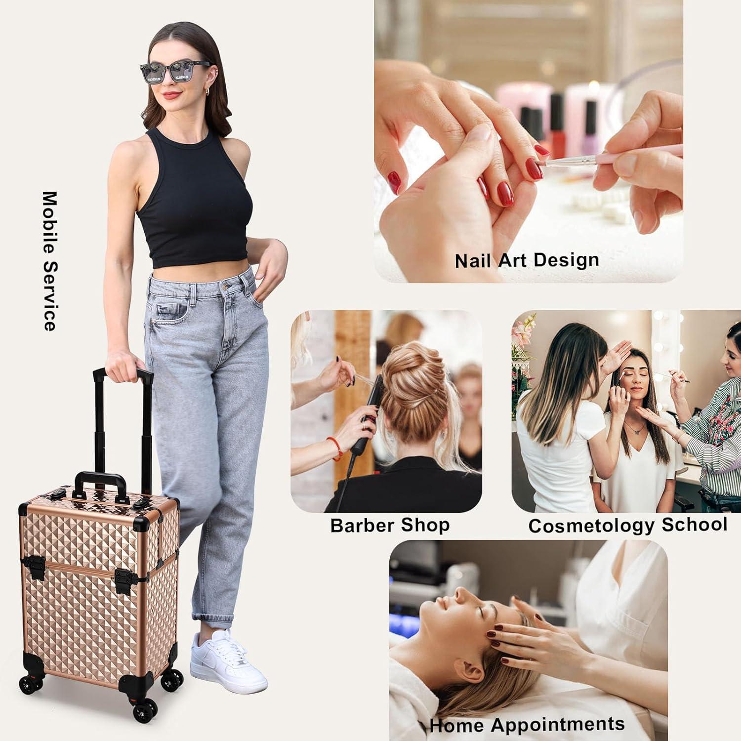 Stagiant Rolling Makeup Case 4 in 1 Cosmetology Case on Wheels Makeup Travel Case with Cosmetic Bag Key Swivel Wheels Salon Barber Case Traveling Cart Trunk Cosmetic Trolley Alpine Black(Alpine Black with Bag)